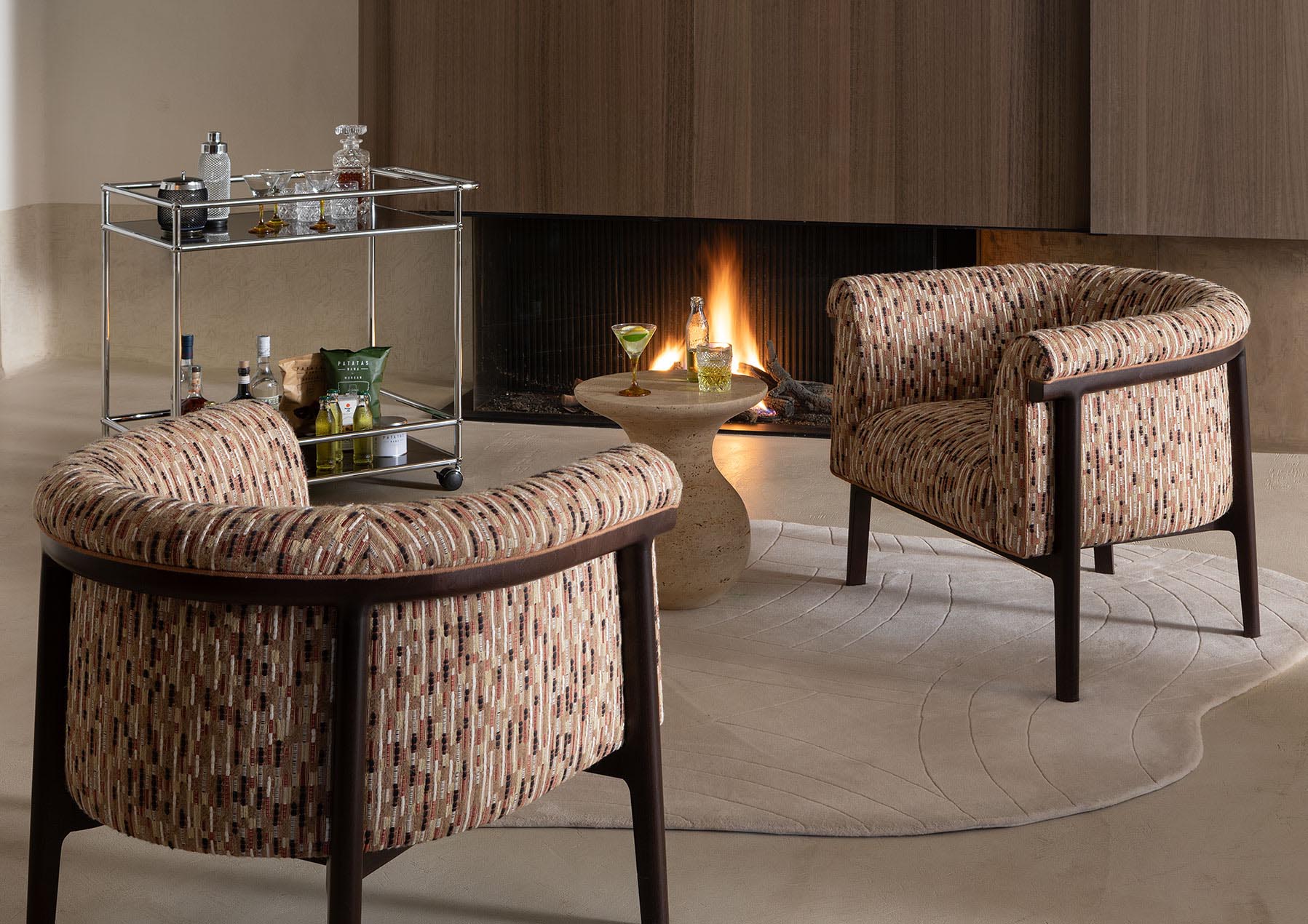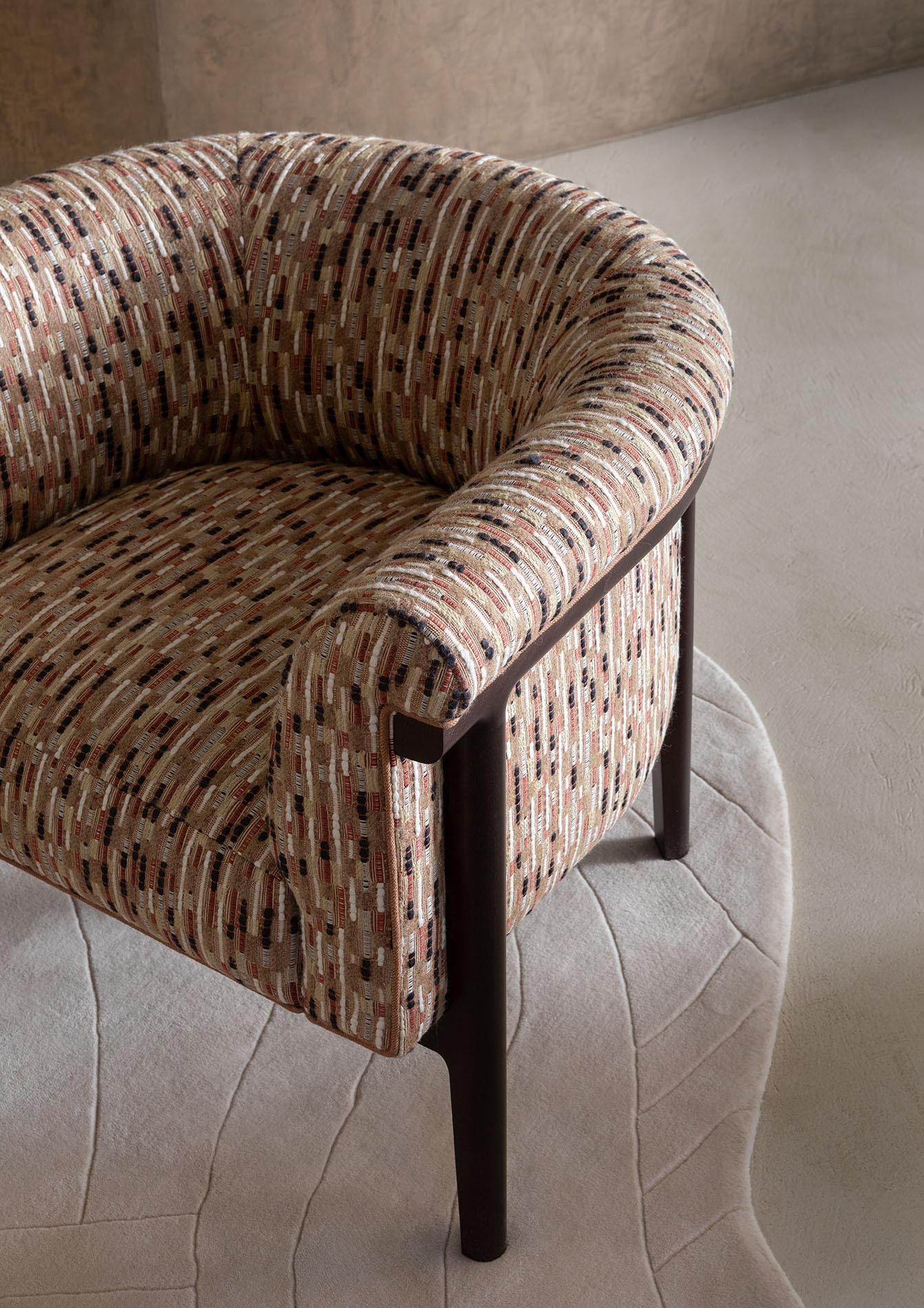 Des lignes discontinues rythment ce jacquard de laine, lin et coton aux teintes subtiles. Les variations de textures et de couleurs ajoutent profondeur et sophistication à l'ensemble, créant un faux uni à l’aspect artisanal riche en nuances.