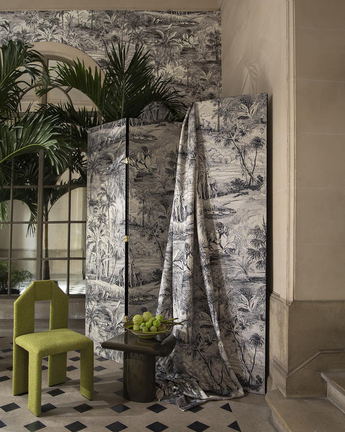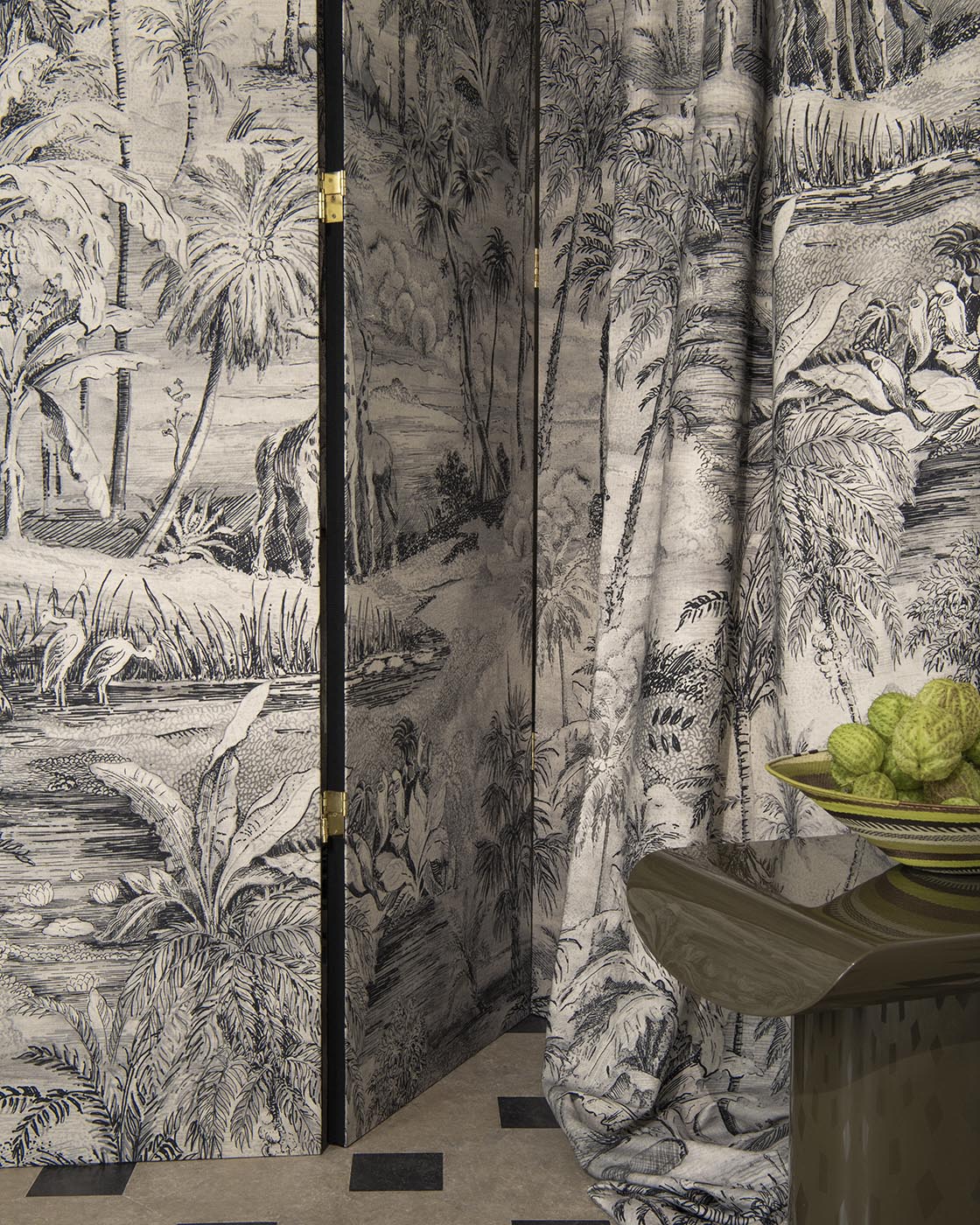 Traité à la manière d’une grisaille moderne, ce dessin est réalisé au feutre. Les mille détails de cette végétation luxuriante illustrent de manière contemporaine et délicate girafes, grues, gazelles se reposant paisiblement. Intemporel et authentique, SAFARI est imprimé sur une belle toile écrue de coton et lin à la main souple et dense.