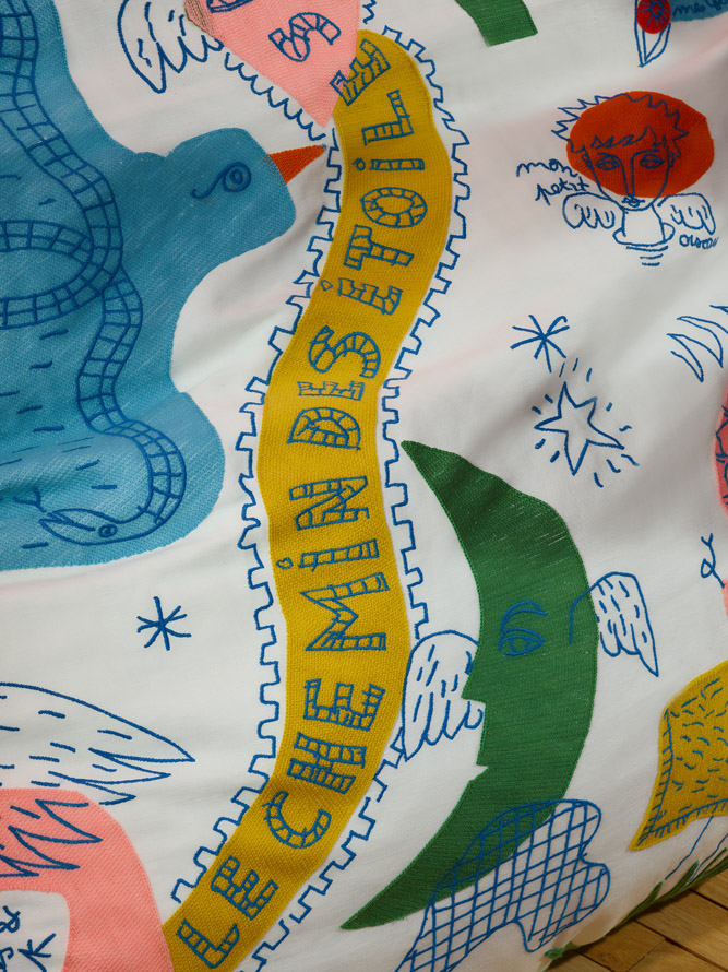 « Sauter à pieds joints dans les flaques de la Voie lactée, murmurer à l’oreille de la Grande Ourse, chercher notre route sur la carte du Tendre… Le chemin des étoiles est celui de nos rêves. Ce dessin ouvre les portes de l’imaginaire. » Jean-Charles de Castelbajac Ce dessin est brodé finement sur une toile de lin écrue.