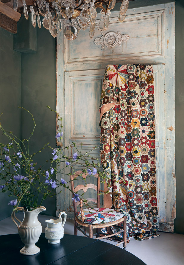 Imprimé en trompe-l’œil inspiré d’un patchwork datant du XIXe siècle et conservé dans les archives de la Maison, QUILT évoque avec authenticité cette activité domestique très répandue dans les pays anglo-saxons qui consistait à faire de la récupération un art.