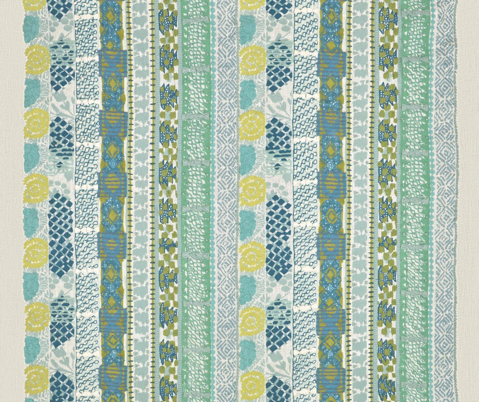 Hommage d’Isabelle de Borchgrave à l’univers de Frida Kahlo lors de sa dernière exposition aux Musées Royaux des Beaux-Arts de Bruxelles. Une série de ceintures et bordures textiles que l’on retrouve dans la garde-robe de Frida : des tissages, des broderies, des motifs floraux, des couleurs chaudes et contrastées. L'artiste admirait le courage de Frida Kahlo, sa liberté créative, son audace vestimentaire féminine. Le studio Pierre Frey a assemblé ces rubans pour créer un ensemble de rayures brodées aux points particulièrement artisanaux et texturés.
