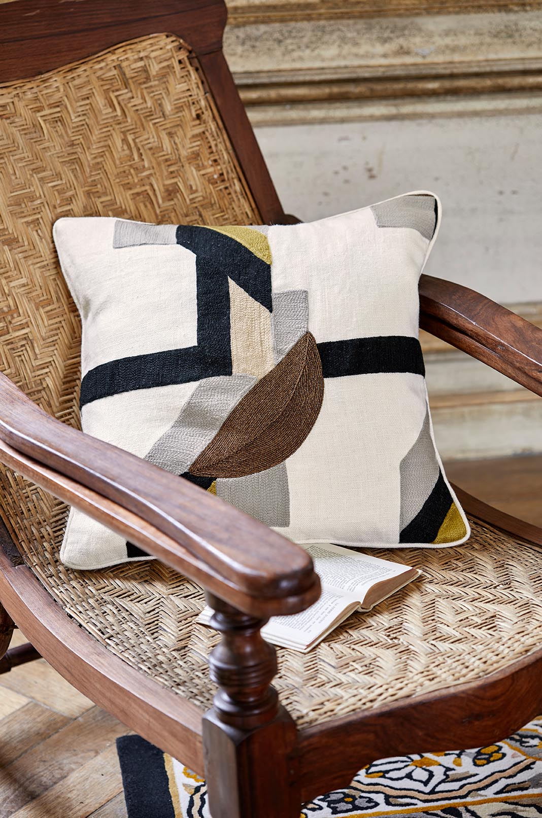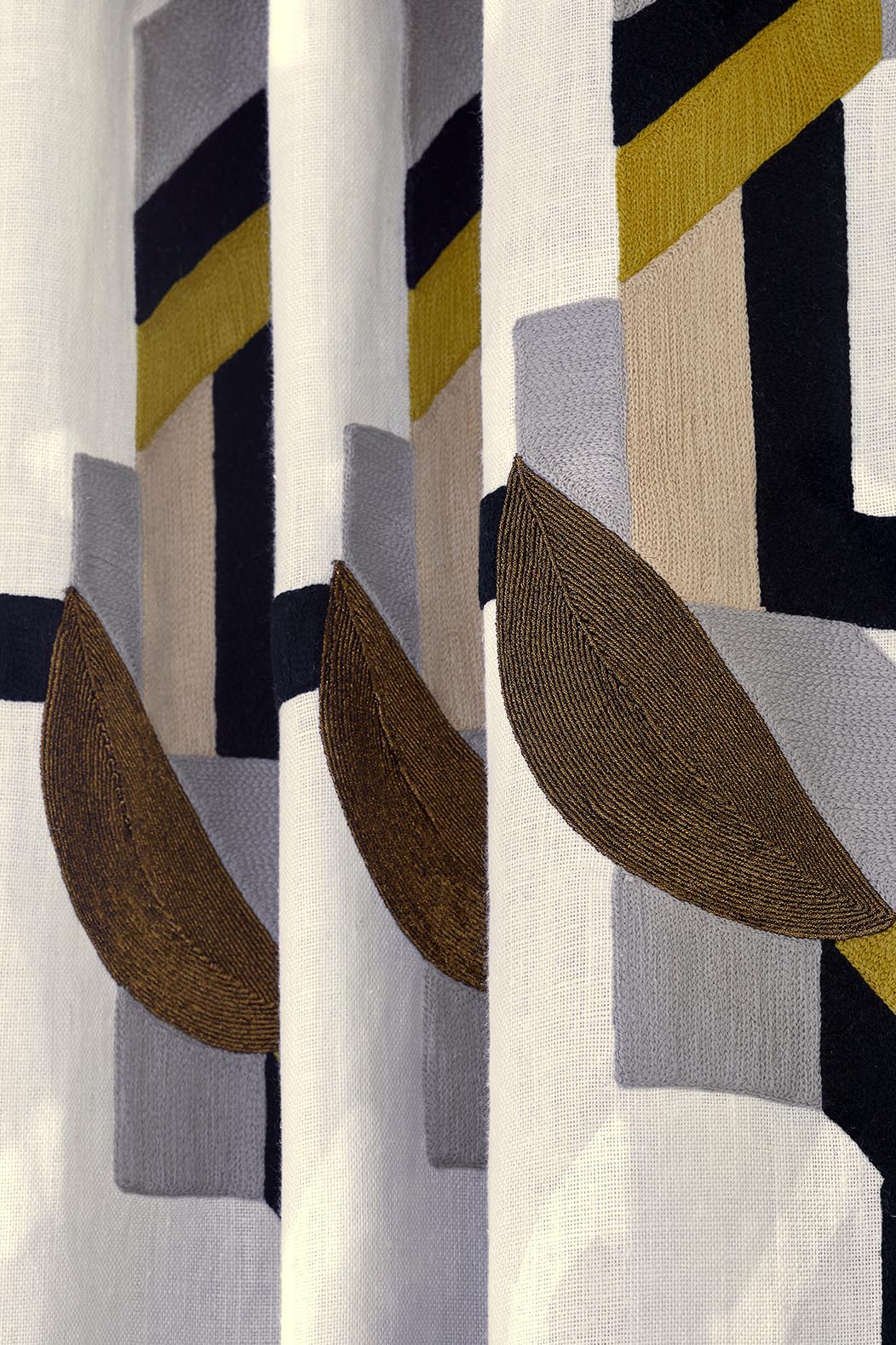 Ces broderies géométriques mates et précieuses aux formes qui s’emboîtent, se complètent et s’entrechoquent. Fils guipés brodés main et fils mats s’harmonisent sur une belle toile de lin.