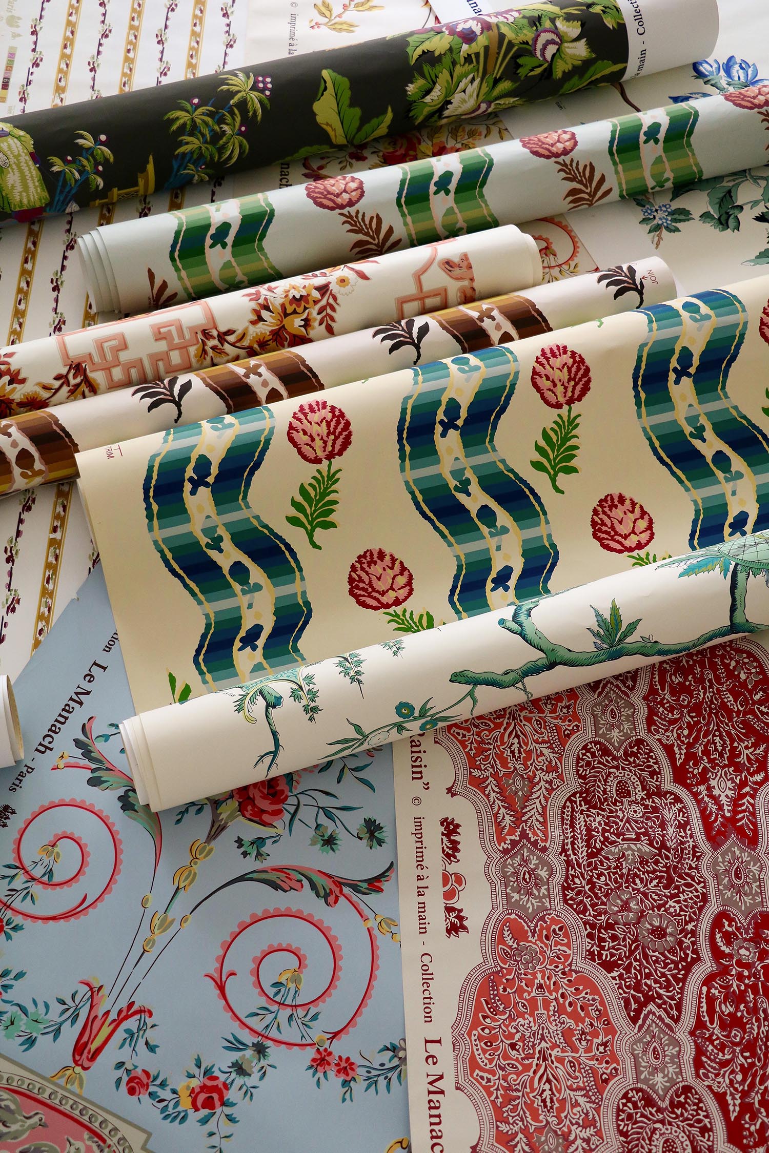 Le motif de ce tissu reproduit une valoise du début du XVIIIe siècle. Cette dernière, mentionnée dès 1669 dans les règlements corporatifs, est une étoffe de soie fine très en vogue à la fin du XVIIe et au début du XVIIIe siècles. Présentant un brillant extraordinaire, elle est ornée de motifs variés, notamment de fleurs. Ce document fut utilisé plusieurs fois par Le Manach qui le reproduisit dans un premier temps en lampas avant d’en faire un des imprimés emblématiques de sa collection.