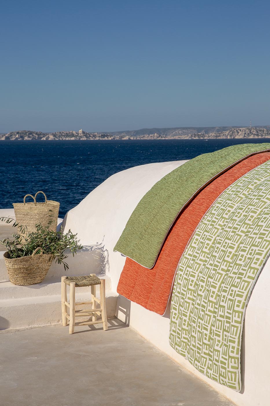 Tissus haute performance, la collection THALASSA revisite les dessins emblématiques de la Maison Le Manach en In-Outdoor aux tissages souples et faciles d'entretien et aux propriétés techniques adaptées à une utilisation en extérieur.