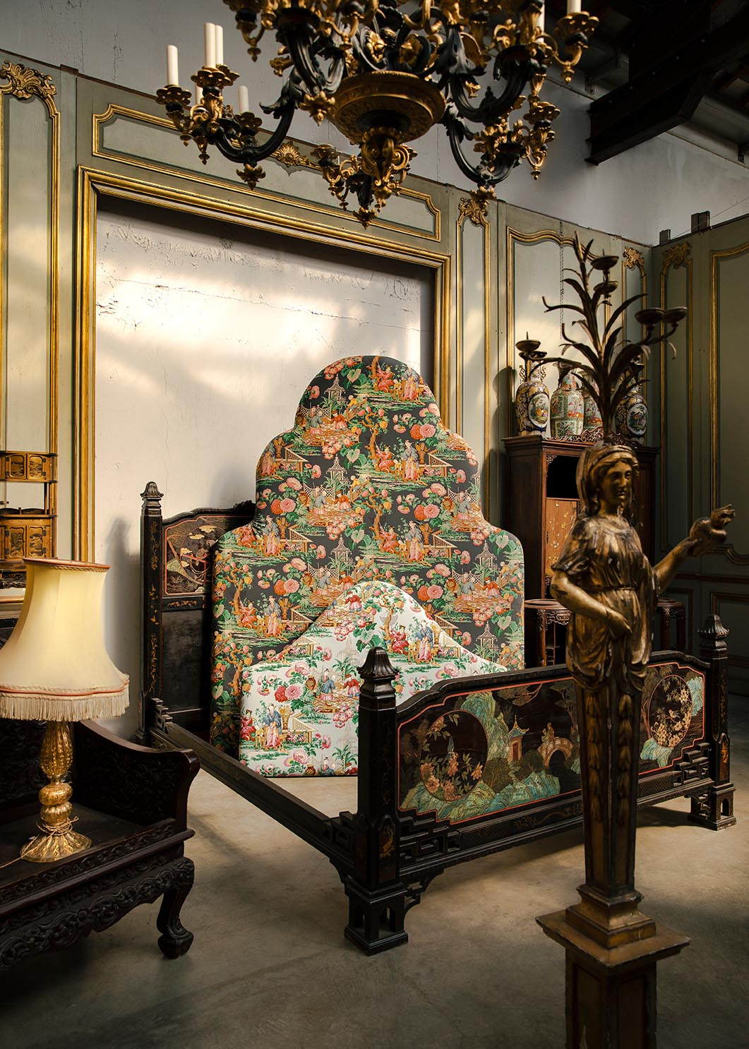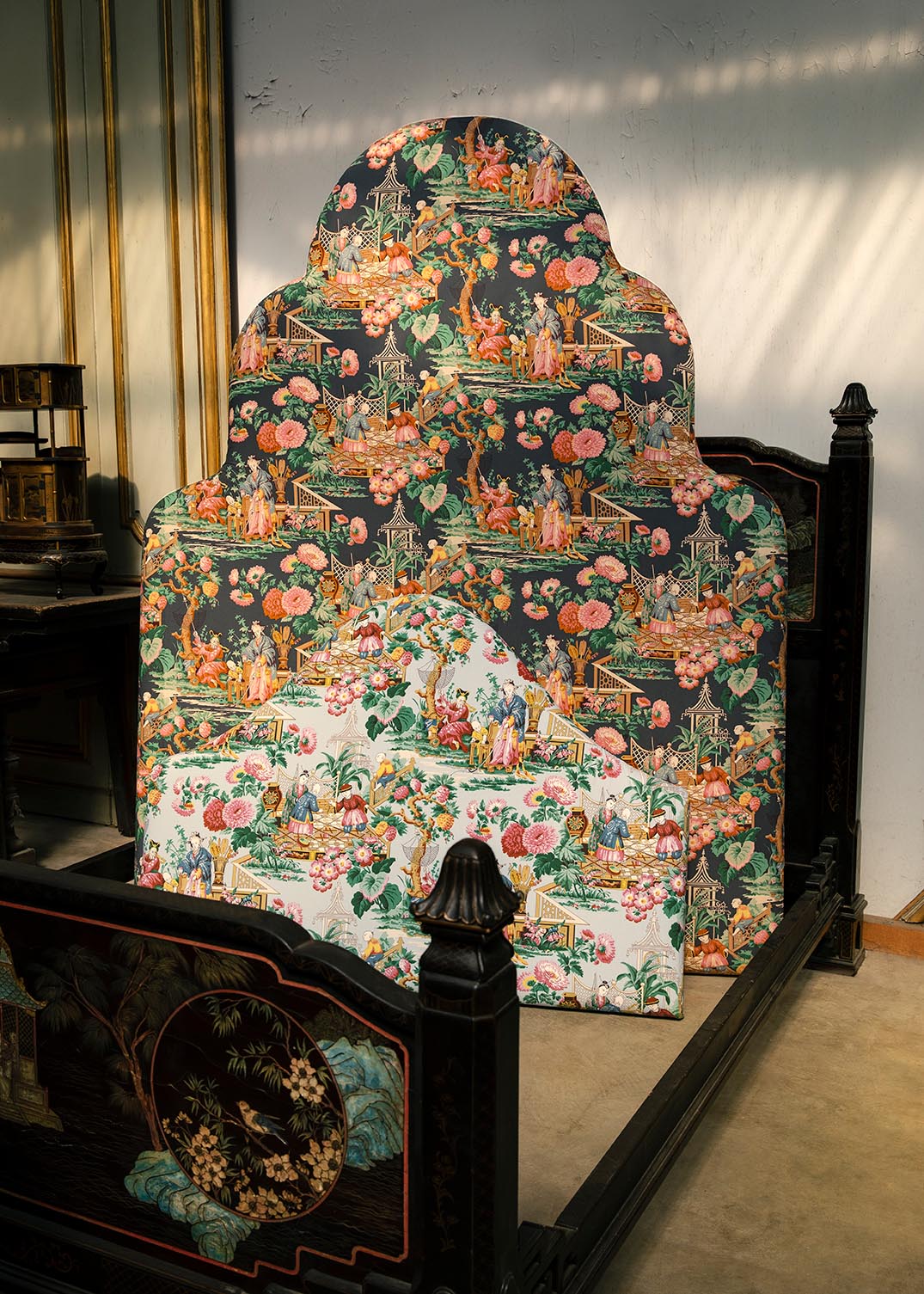 Reprise d’un magnifique document issu des archives Le Manach, LES PORTUGAIS est imprimé, en France, sur cretonne de coton, au cadre à la main. Représentant des scènes inspirées d’anciens comptoirs asiatiques, ce ravissant dessin est décliné dans de somptueuses harmonies de couleurs.