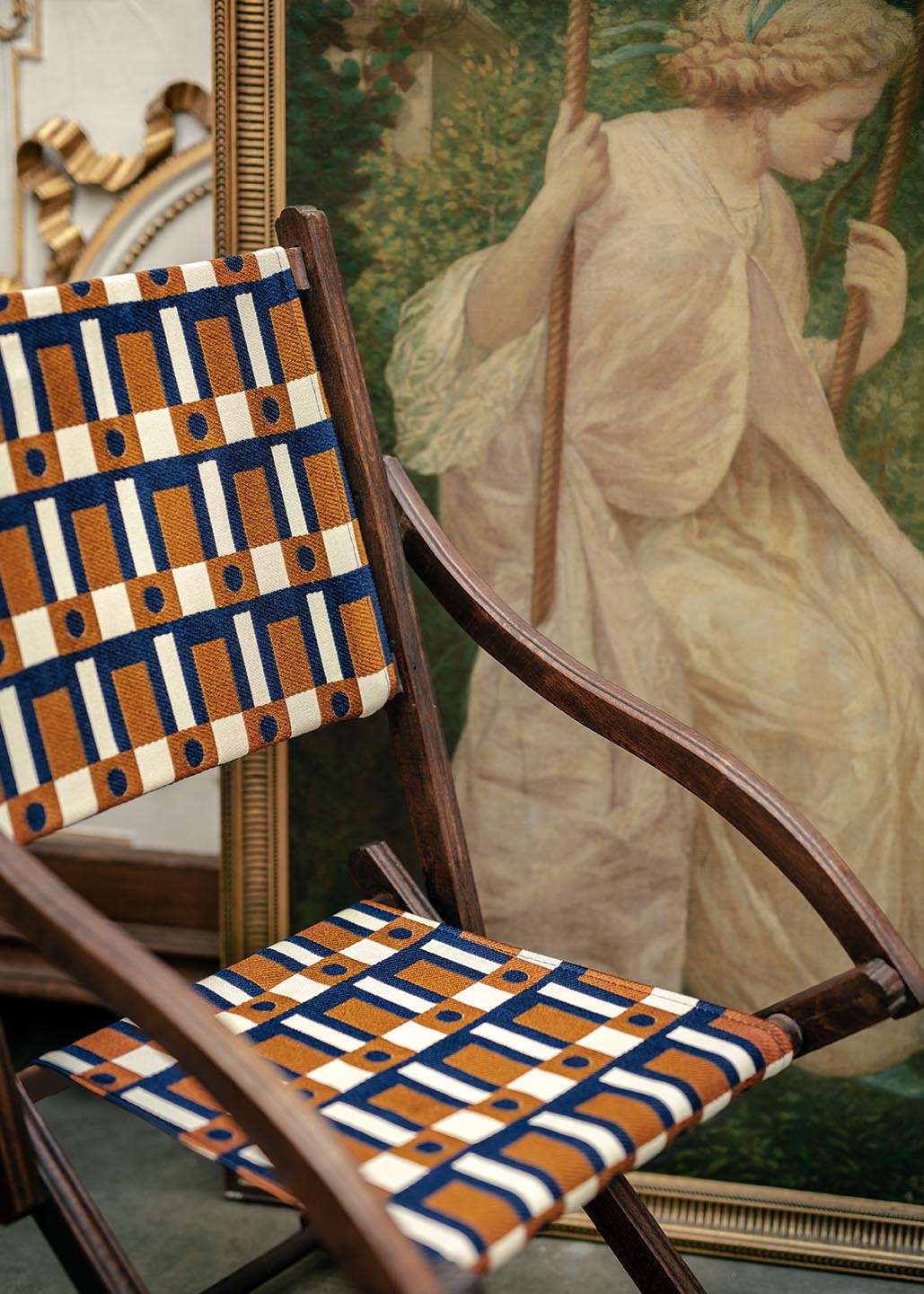 Adaptation d’une archive de la Maison Pierre Frey, ce jacquard aux accents modernistes dessine des formes géométriques entre rayures et carreaux.