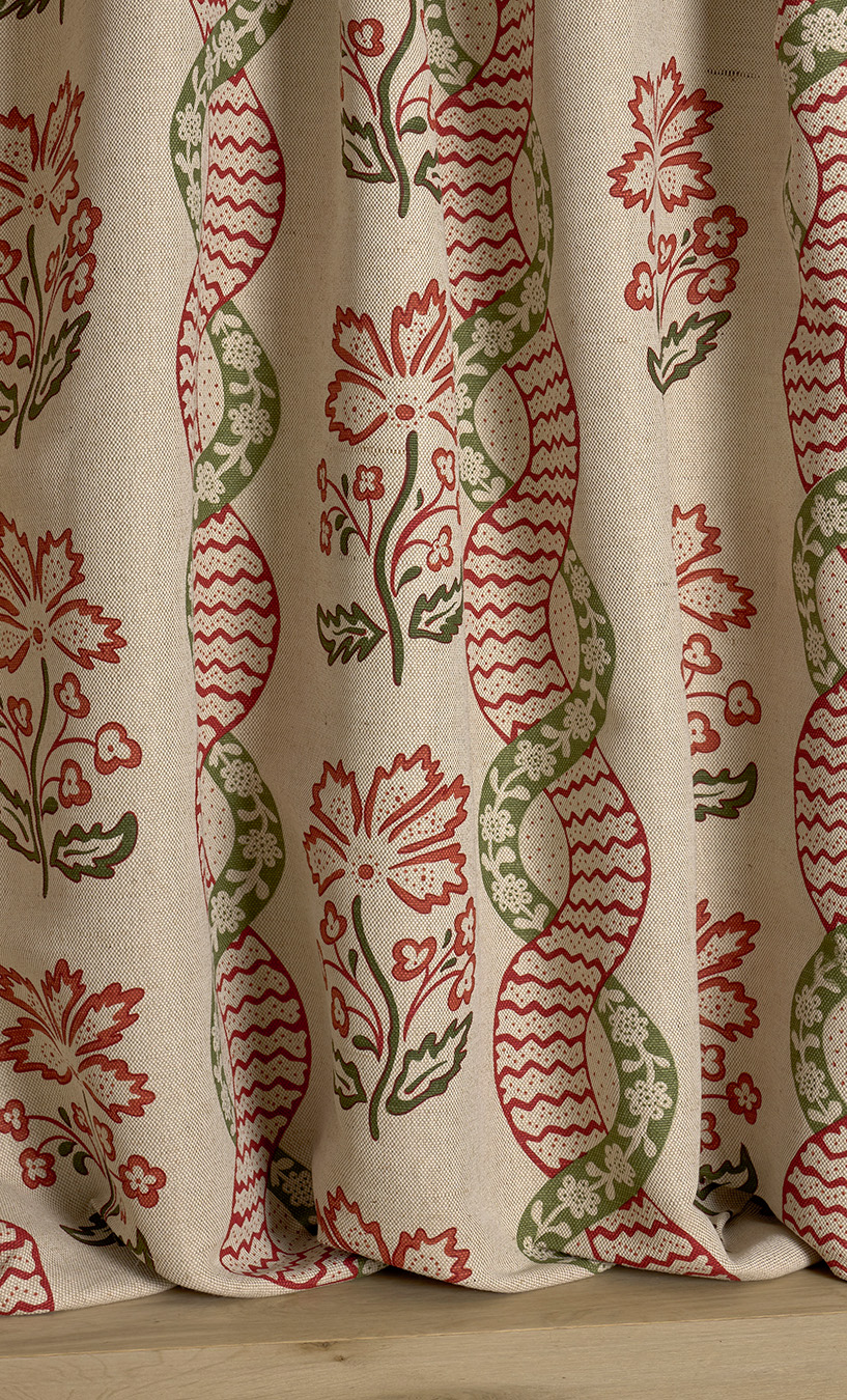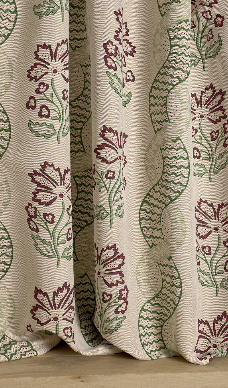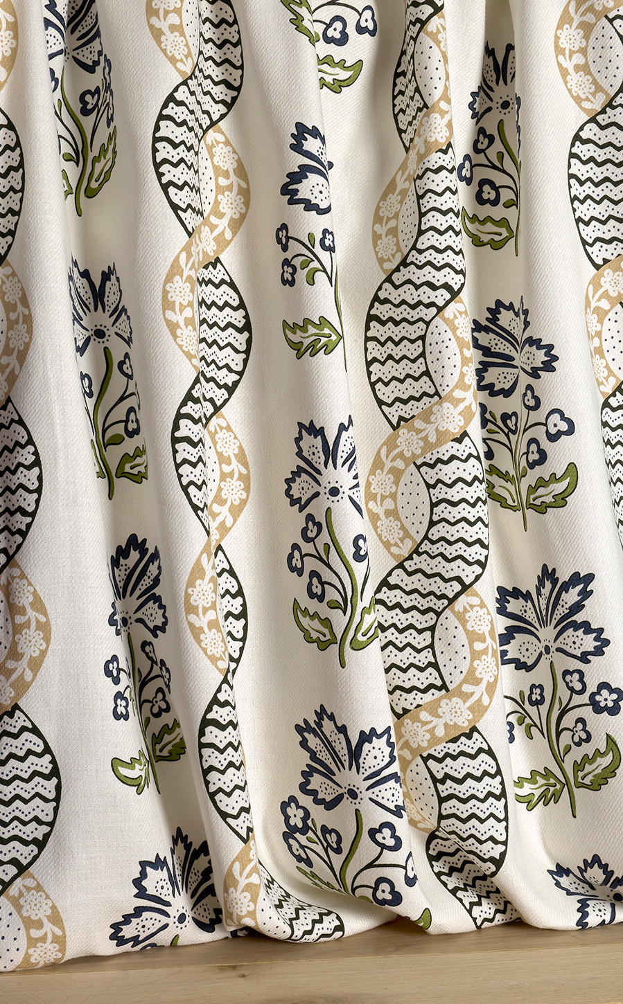 Inspiré des toiles imprimées de la seconde moitié du XVIIIe siècle, CAVALERE se compose d'effets de rubans en spirale et de fleurs stylisées.
