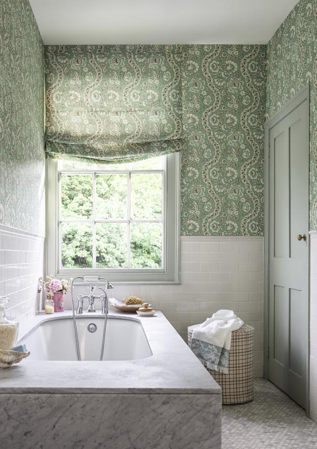 ANTOINETTE reprend un modèle imprimé à la planche de bois vers 1760-1770. Son motif de tiges sinueuses fleuries et de rubans ondulants exalte les plaisirs de la campagne.