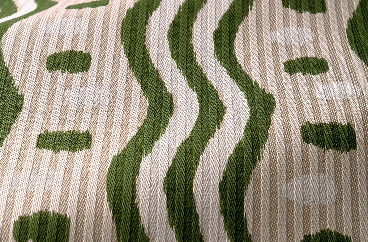 Taches et bandes ondulantes se détachent sur un contre-fond rayé pour un résultat ludique et graphique.