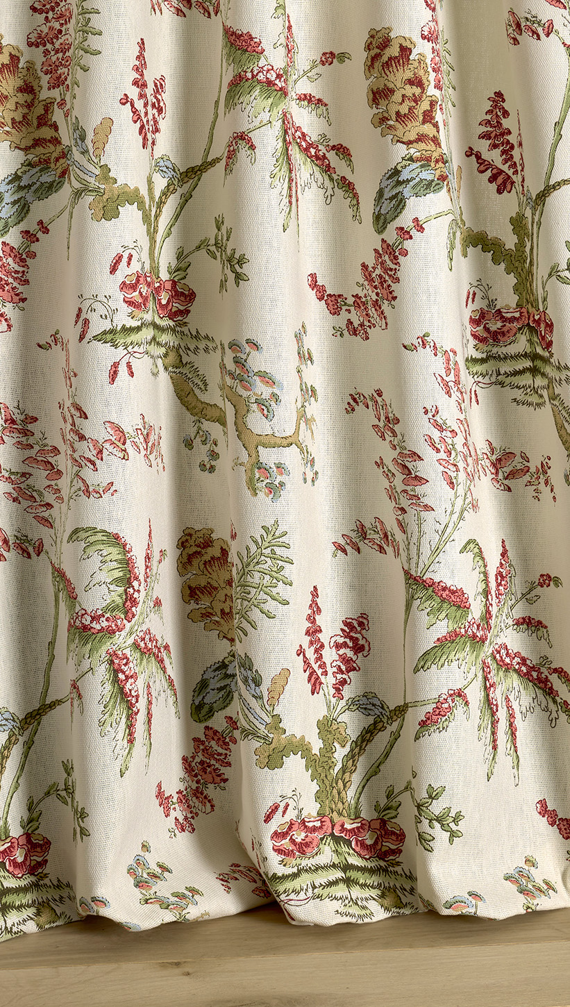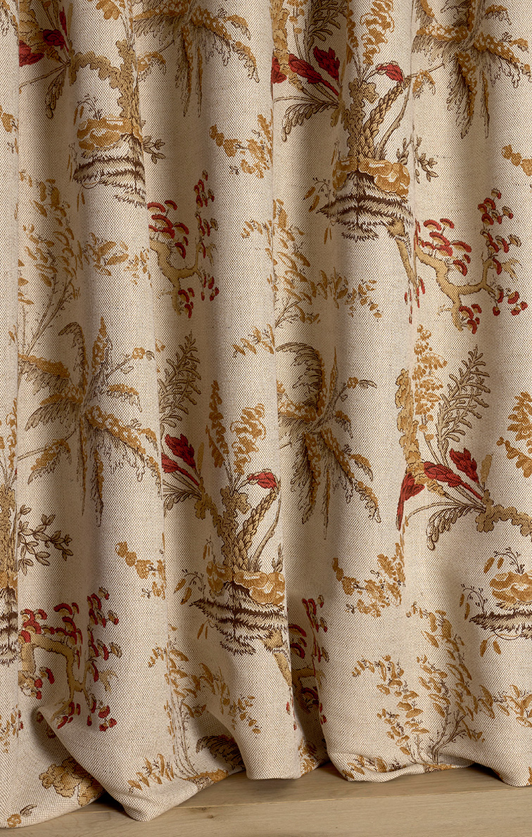 Reproduction d'une toile imprimée à la planche de bois du dernier quart du XVIIIe siècle, MADRAS THORP est représentatif du goût pour l'exotisme de cette période.