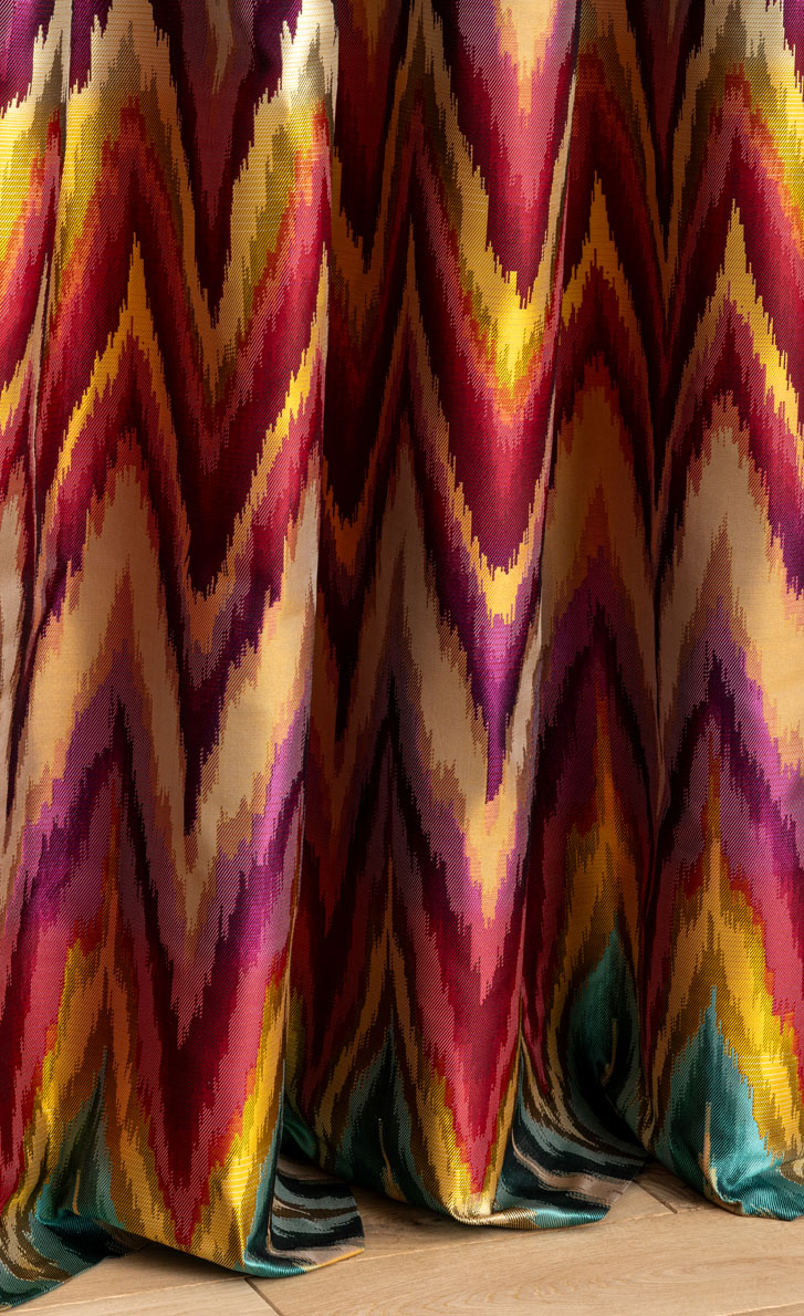 Inspiré des magnifiques chapans d'Asie centrale, ce jacquard soyeux déploie toute sa splendeur.