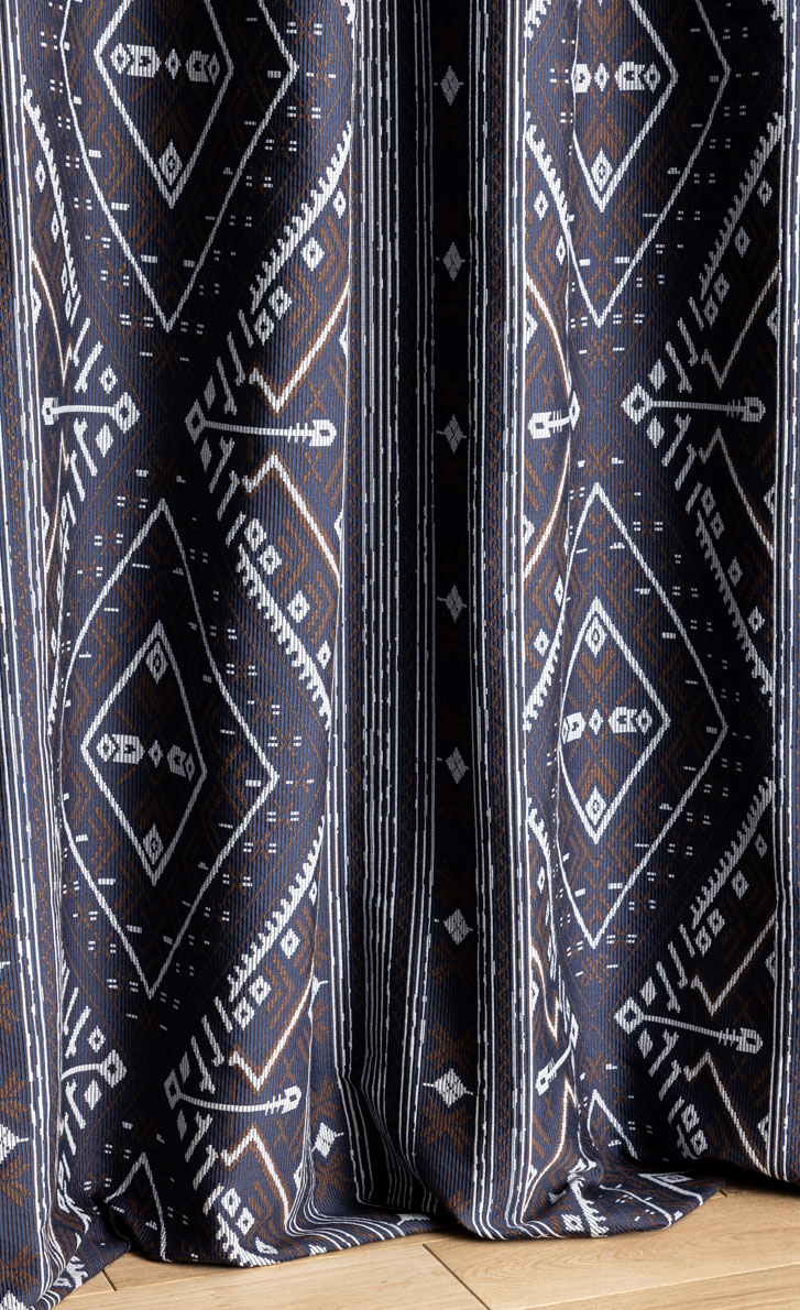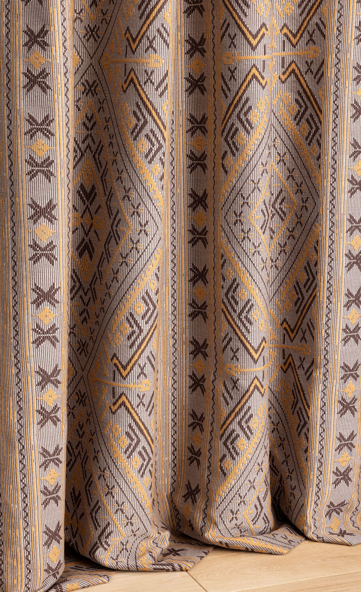 Ce très beau jacquard s'inspire des kilims orientaux. Le mélange de coton et de laine lui confère authenticité et douceur envelopppante.